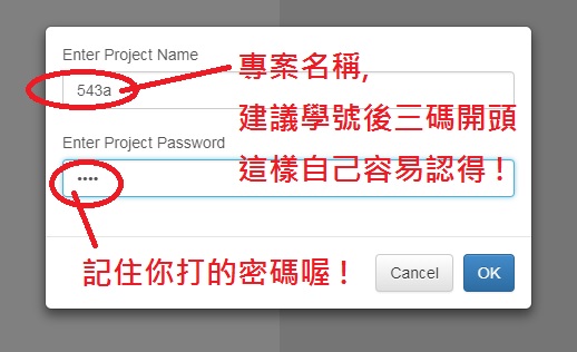 (2)在彈出的小窗輸入專案名稱(Project Name), 和 對應這專案的密碼 (以後開啟這專案要用)