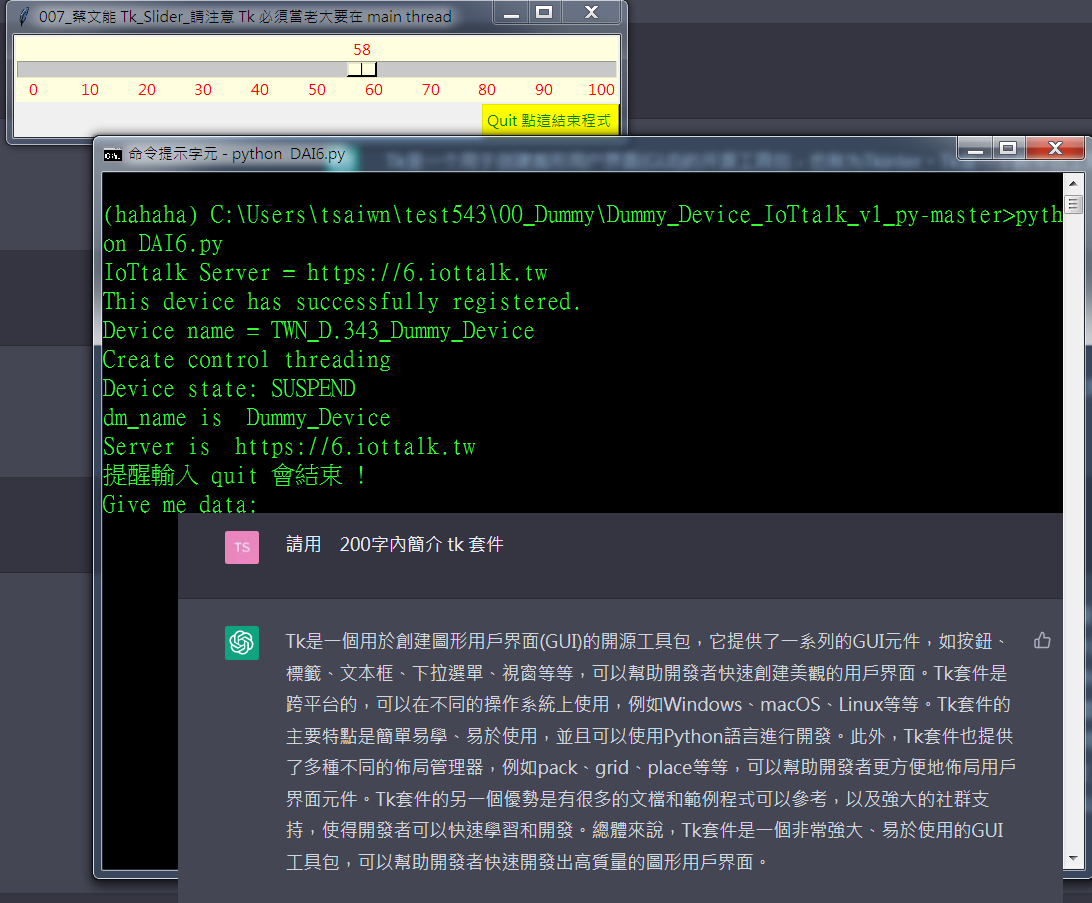 你可以把 demo 改為 class (IP 自己查:-) 就可以通過 port 9999 與IoTTalk Server 溝通。